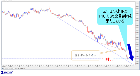 これには、ユーロ/米ドルの急落がもたらした影響が大きい。デフレ懸念がくすぶる以上、ECB(欧州中央銀行)が早期QE(量的緩和)に踏み切る観測が高まり、年末年始の薄商いもあって、ユーロ/米ドルは1.18ドルの節目割れを果たしている。