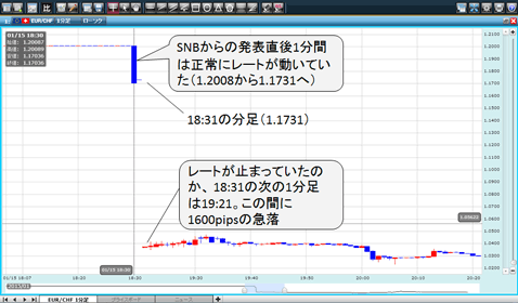SNBの発表から1分間で1.20フランから1.17フランまで急落したが、まだまともなローソク足となっている。ぶせな氏のストップ注文が約定したのは、この1分の間だ。おそらく1.20スイスフランの直下に置かれたストップ注文はギリギリまともに約定していたのだろう。
