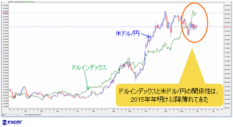 上の米ドル/円とドルインデックスの比較図を見ればわかるように、アベノミクス以降、高い相関性を示してきた両者の関係に、2015年年明けから異変が生じてきた。