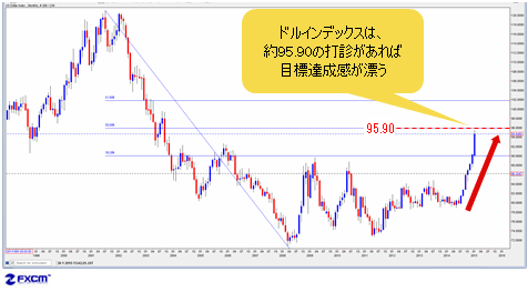 ドルインデックスの月足から考えて、2001年7月高値を起点とした全下落幅の半分押し(約95.90)の打診があれば、目標達成感が漂うだろう。