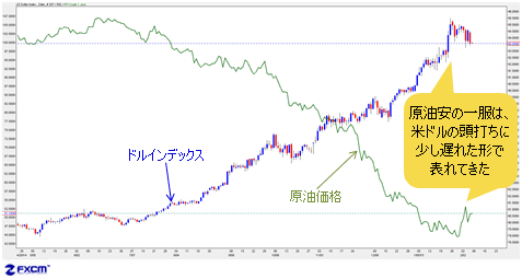 原油安の背景は複雑で、一概に言えない側面が大きいものの、もっともシンプルでわかりやすい説明は、要するに「米ドル高の進行が原油価格を押し下げてきた」というものだ。