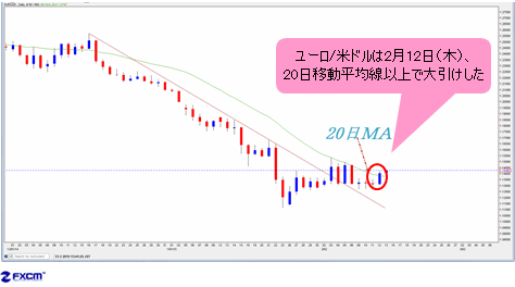 ところで、ユーロ/米ドルの方は、ギリシャに関する合意が先送りされる中、米経済指標が芳しくないこともあって、昨日(2月12日)、20日移動平均線以上で大引けとなった。