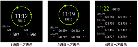 表示方法は、「1通貨ペア表示」、「2通貨ペア表示」、「4通貨ペア表示」と3種類の表示方法があり、さらに、表示させたい通貨ペアを選ぶことも可能だ。