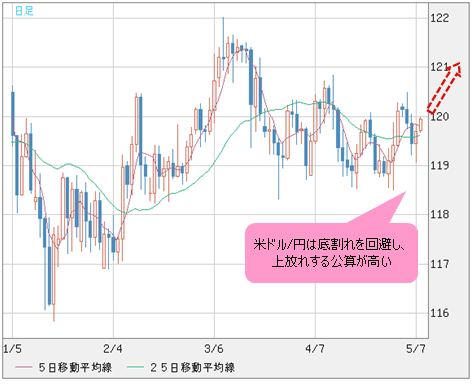 本日(5月8日)の米雇用統計の影響を考慮しても、基本的には米ドル/円は底割れを回避でき、上放れの公算が高いとみる。