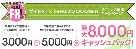 さて、そんなGMOクリック証券「FXネオ」では、現在新規口座開設で合計8000円がもらえるキャッシュバックキャンペーンを実施しています!