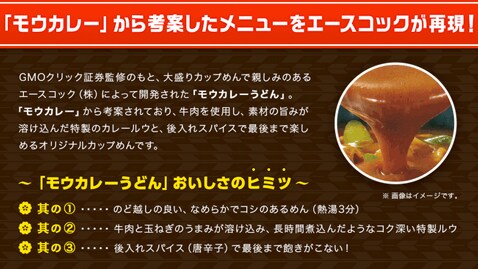 実は、今回の「モウカレーうどん」は、その「モウカレー」をもとに考案したものを、なんとエースコックさんが商品化したというものなんです!