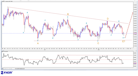 119関門の一時ブレイクを受け、3月高値122.02を起点とした大型保ち合いの延長を示唆。この場合、ディセンディング・トライアングルの整理パターンがなお維持されるが、最終子波(E、黄)、5日高値120.50から展開したと見做され、底打ちを確認してから大型保ち合いの終焉をもたらすでしょう。