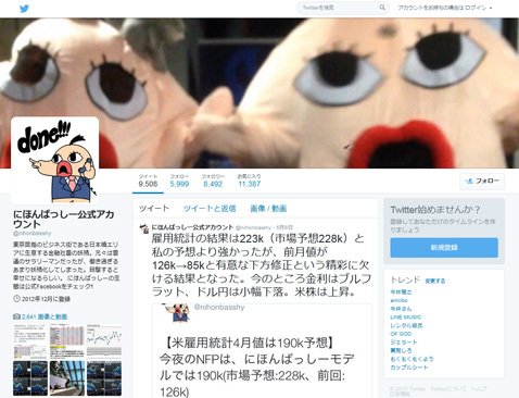 特に、米雇用統計の重要指標、NFP(非農業部門雇用者数変化)の数値を予測する「にほんばっしーモデル」は、よく当たるとフォロワーのみなさんの間でも評判。