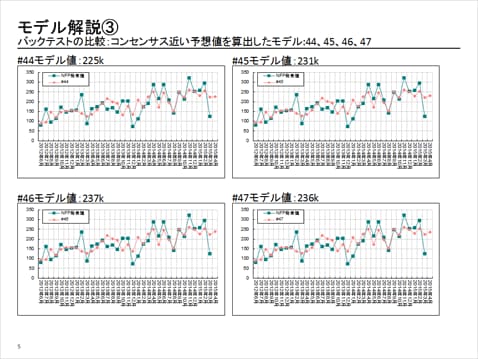 で、5月に発表された4月米雇用統計のNFPを予想するにあたって、Aさんは、サンプル数、35、36、44、45、46、47、53、55カ月を選び、バックテストを実施。モデル予想値を算出しました。