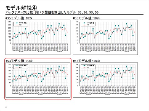 「ええ。過去31カ月~55カ月分のサンプルを使って、それぞれのモデルがどんな予想値になるのかを算出しています。そして、その予想値が実際の結果とどれだけシンクロしているかをまず見ていくんです」