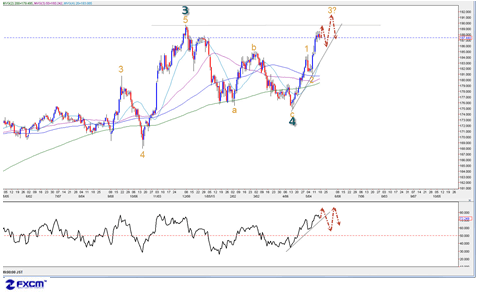※2月高値185.02のブレイクをもって同カウントの蓋然性を強化、昨年の高値更新をもって推進子波の一段加速に繋がり、190関門の打診を目指すでしょう。
