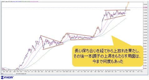 こういった長い保ち合いを経てから上放れを果たし、その後、一本調子の上昇をもたらす局面は、今まで何度もあった。単純に言えば、その繰り返しである。