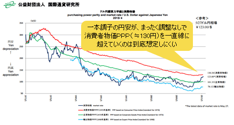「相場は行きすぎるものだ」という反論を汲んでも、一本調子の円安が、まったくの調整なしで消費者物価PPP(購買力平価、≒130円)を一直線に超えていくのは到底想定しにくい。詳しくは、過去のコラムをご参照いただきたい。