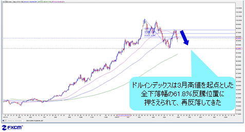 ドルインデックスでみると、5月安値を起点とした切返しは、いったん3月高値を起点とした全下落幅の61.8%反騰位置に抑えられて、再反落してきたので、昨日(6月4日)まで外貨の反騰につながった。
