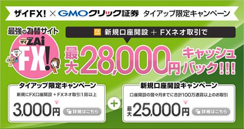 GMOクリック証券「FXネオ」では現在、新規口座開設で最大2万8000円のキャッシュバックが受けられるキャンペーンを開催中です。