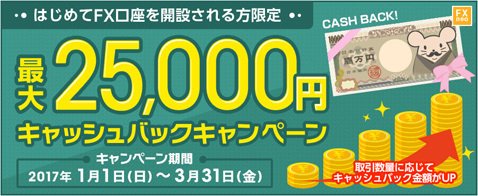 キャンペーンの内容は100万通貨以上の新規取引で3000円、その後は取引量に応じて最大2万5000円がキャッシュバックされるというもの。
