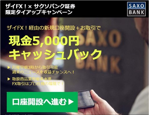 サクソバンク証券「アクティブトレーダーコース」では、なんでもいいから1回取引するだけで現金5000円がもらえる、ザイFX!限定タイアップキャンペーンを開催中です。