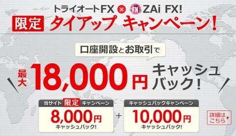 そして、インヴァスト証券「トライオートFX」の新規口座開設なら、AP(オートパイロット)注文による往復1回以上の取引で、8000円がキャッシュバックされるザイFX!限定タイアップキャンペーンがお得です。