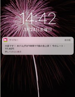 たとえば、米ドル/円の1時間足で相場が大きく動いたとき、iPhoneの画面上に相場の急変をお知らせするメッセージが届く。
