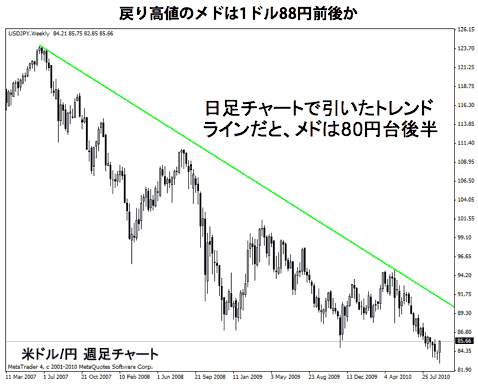 松崎 介入効果で上がっても、上値のメドは87~88円、正直90円は難しいと思っています。日足で抵抗線を引くと、ちょうどそのくらいのところに来るんですよ(下のチャート参照)。