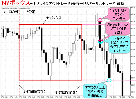以上がNYボックスの「ブレイクアウトトレード」だが、最初に述べたとおり、NYボックスのトレード手法の中にはもう1つの種類がある。それが「リバーサルトレード」だ。