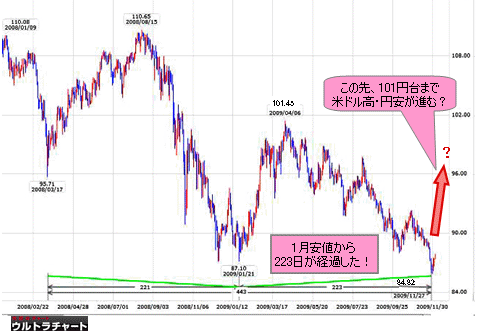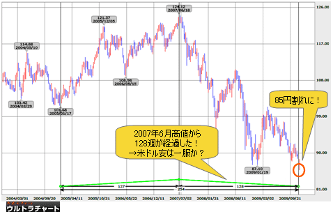 米ドル/円は、2005年1月安値から2007年6月高値まで、127週を要したが、その高値から先週の安値までは、128週を要している。同じリズムで考えれば、米ドル安が、このあたりで一服してもおかしくはない。