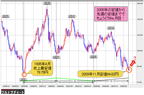 上の米ドル/円の月足チャートを見ると、1995年の安値から1999年の安値まで、56カ月の周期を要していることがわかる。そして、1999年の安値から2005年の安値までは63カ月を要している。