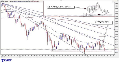 この5年サイクルが、2009年の年末につけた安値ですでに完成していたとすれば、ここから先は、米ドル/円のダマシも想定しておかなければならない。