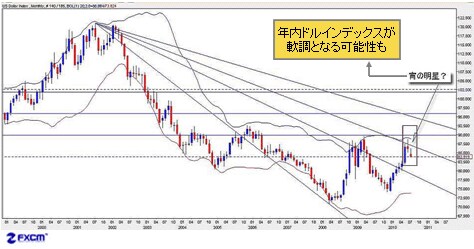 そうなれば、ドルインデックスが今年いっぱい軟調となる可能性を示唆するサインとなるだろう。下のチャートをご覧いただきたい。