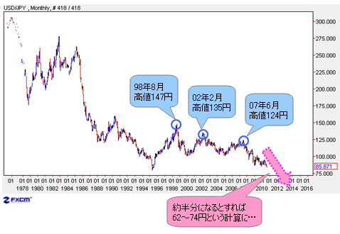 「高値の出発点をどこに取るかということがちょっと問題です。1998年の147円だとしたら、半分は73~74円、2002年の135円だったら半分は67~68円、2007年の124円だったら半分は62円ですね」