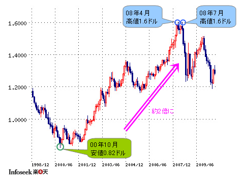 たとえば、ユーロ/米ドルもそうですよ。ユーロ/米ドルは2000年の安値0.82ドル台から、2008年の1.60ドル台まで上昇しました。これは下落ではなく、上昇の例ですが、ざっくり2倍になってるんです」