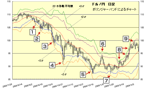 昨年12月の安値から、ドルは急速に切り返し、1月6日には94.63円まで上昇し、20日線はもちろん、「+2σ」のバンドを超え、「+3σ」のバンドを打診しようとした(数字6)、これは昨年8月以来のことであっただけに、基調変化の可能性を強く示唆していた。
