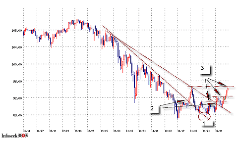 これは2月18日の値動きに象徴されていた。当日、ドルインデックスは昨年11月の高値に接近していたが、リスク回避の動きからドルと円が買われるといった従来の構造ではなく、ドルのみが買われ、円は売られた(当日、ユーロ/ドルは1.2512ドルまで売られたが、ドル/円は93.95円まで買われた)。