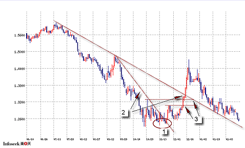 さて、前回言及した「1−2−3の法則」について、以下、ユーロ/ドルの日足で説明しよう。