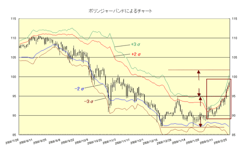 最後に、100~102円をターゲットとするテクニカル的な根拠は現在多くの方が解釈しているので、ここでは省略させていただくが、新たにボリンジャーバンドをつけたチャートを提示してみることにしよう。