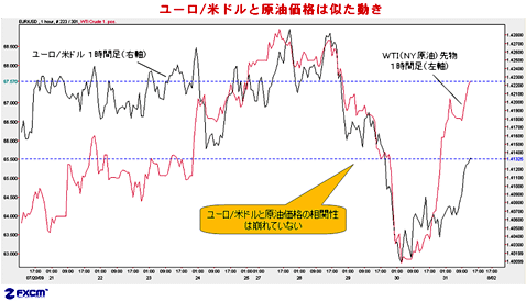一方、ユーロ/米ドルとWTI(NY原油)先物の値動きとの相関性は崩れていないようだ。下に示した比較図(1時間足)を見れば一目瞭然だ。