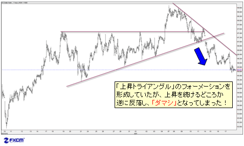 ところが、ターゲットをトライするどころか逆に反落し、「上昇トライアングル」のパターンを消滅させてしまった。