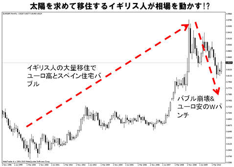 西原 で、スペインに移住するイギリス人が急増して、ユーロ/英ポンドは2005年に0.7ポンドぐらいだったのが2008年には0.98ポンドまで上がったんだよね。