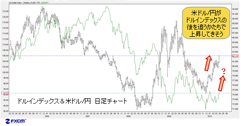 本質的には、時間差はあるものの、米ドル/円はドルインデックスの後を追うかたちで上昇してくる可能性が考えられる。