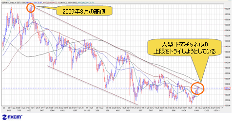 英ポンド/円は、昨年8月高値から形成された大型下落チャネルの上限をトライしようとしている。