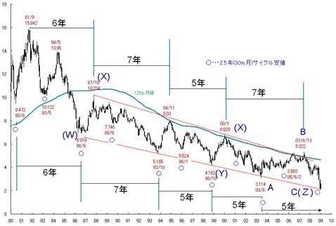 ただ、過去2回の5年サイクルはどちらも安値から安値となっています。前回の安値が2005年1月ですから、きっちり5年で来れば、次の安値は2010年1月ということになります。
