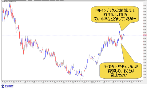 以上、まとめると、ドルインデックスは依然として昨年5月以来の高い水準にあるが、その一方で、全体の上昇モメンタムが衰弱しているということを見逃してはならない。