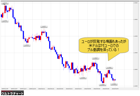 相場のサイクルに沿った値動きになれば、来るべき米ドルの全面安の背景として、米国のソブリンリスクがいずれ浮上してくるではないかと見ている(「米国の景気回復シナリオは裏切られ、米国のソブリンリスクは必ず問題となる!」を参照)。