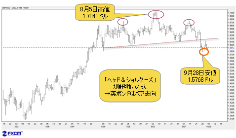 それにより、下に示した日足チャートを見てわかるように、8月5日につけた高値1.7042ドルをトップとする「ヘッド&ショルダー(※)」のフォーメーションが鮮明となった。つまり、英ポンドのベア(弱気)志向を示唆しているのだ。