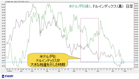 米ドル/円の週足とドルインデックスの週足を比べると、ドルインデックスと大きく相違した時期(赤線で囲まれた部分)があることがわかる。