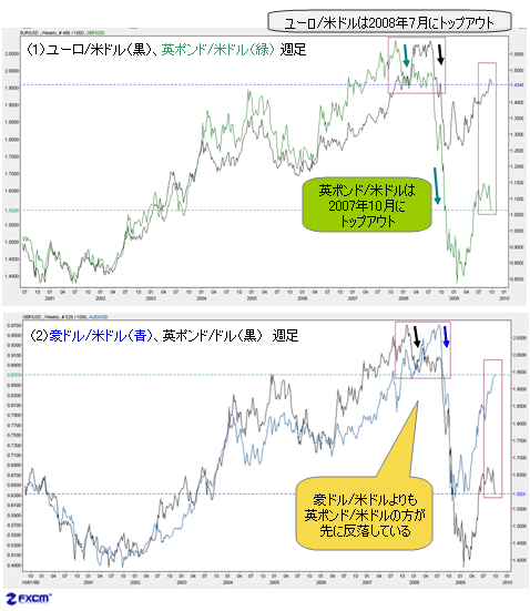 基本的に、両者は同じような値動きとなってはいるが、英ポンドは2007年10月にトップアウトしたのに対し、ユーロはそれから1年後の2008年7月になって、ようやくトップアウトしているのだ。
