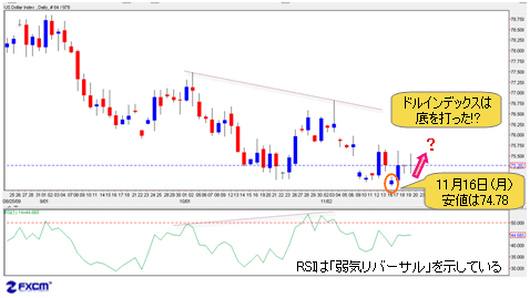 11月16日(月)のドルインデックスの安値は74.78、終値は74.92だった。つまり、前述のターゲット値に接近していることがわかる。