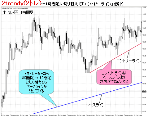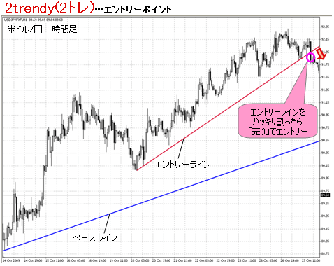 上昇トレンドのチャートを例にすると、1時間足のローソク足がエントリーラインを割ったところ…ここが2トレのエントリーポイントとなる。この時、「売り」でトレードを開始するのだ。