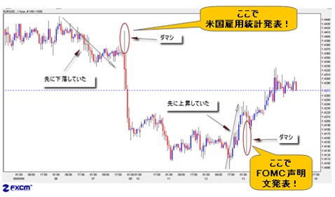 ユーロ/米ドルの1時間足を見ると、米国雇用統計、FOMCの両イベントの後に「ダマシ」を記録している。このことからも、より一層、相場の先行性が証明されているように思われる。