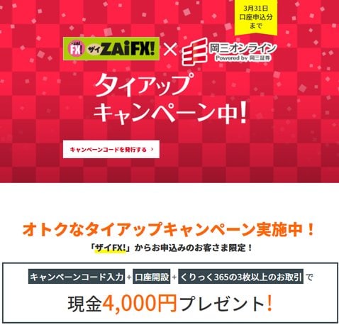 また、旧岡三オンライン証券で取り扱っている口座の口座開設がまだであれば、ザイFX!限定タイアップキャンペーンの対象となるチャンスもあります!